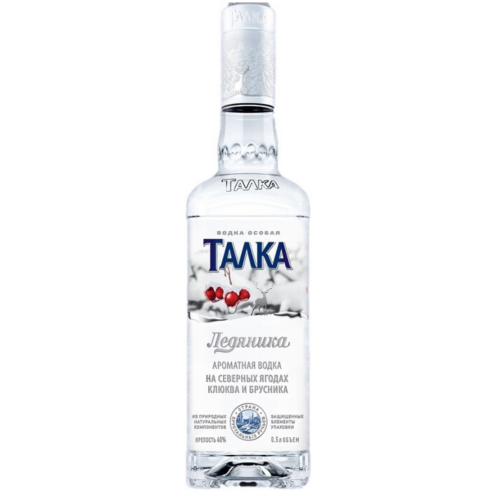 "Талка" Ледяника — новинка в ассортименте "Талка". Водка создана на основе натурального настоя северных ягод. Уникальная этикетка с переливающимися ледяными ягодами и искрящимся на них снегом подчеркивает яркость и неповторимость вкуса водки, сочетающего в себе чистоту нетронутой сибирской природы, морозную свежесть и ароматные тона клюквы и брусники.